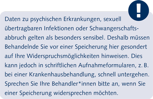 - Behandelnde müssen Patient*innen vor einer Speicherung gesondert auf ihre Widerspruchsmöglichkeiten hinweisen. Dies kann jedoch in schriftlichen Aufnahmeformularen, z. B. bei einer Krankenhausbehandlung, schnell untergehen.